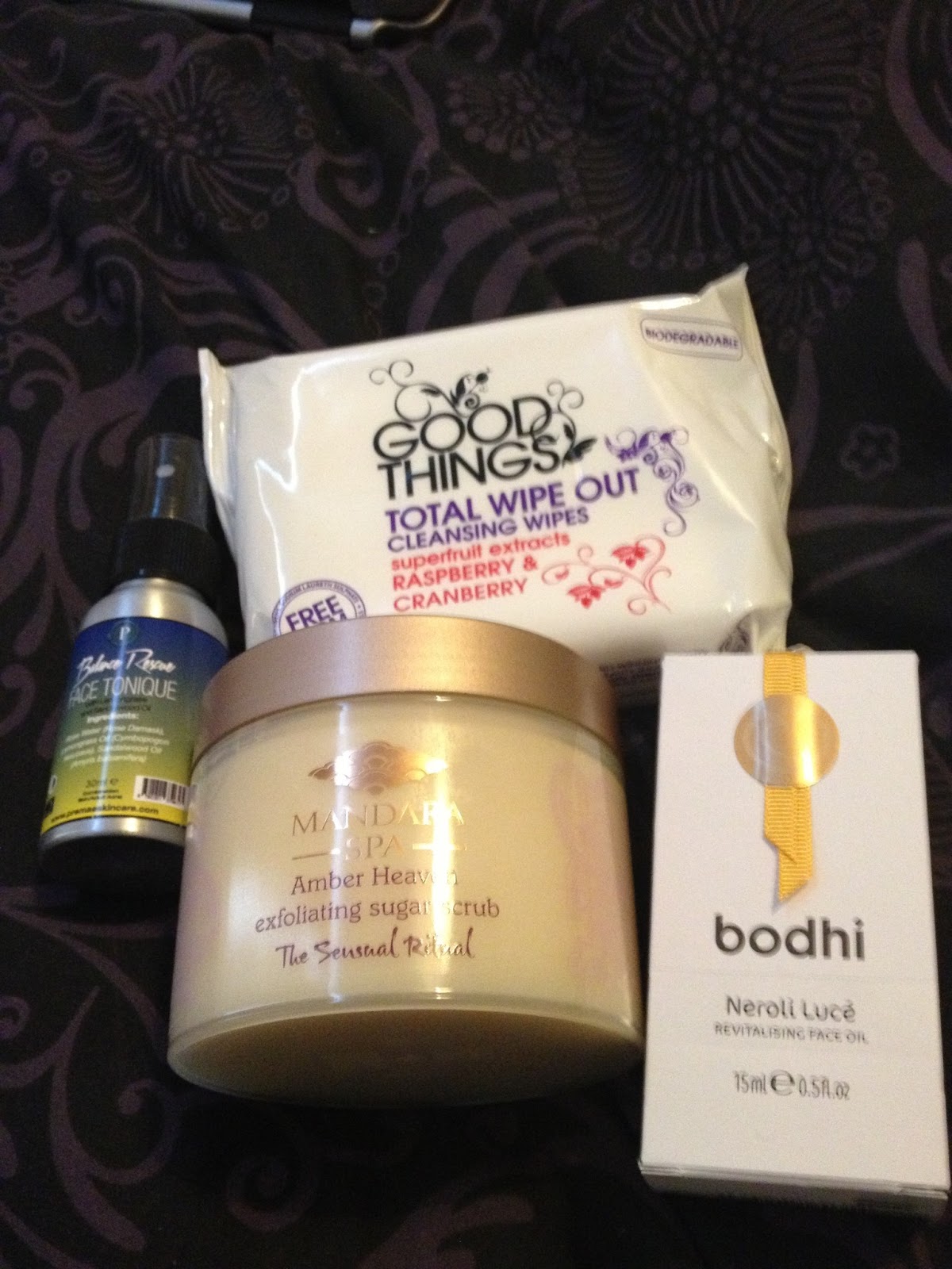 Good Things Cleansing Wipes, Mandarin Spa Amber Heaven sugar scrub, Bodhi full size Neroli Luce face oil and Premae Rescue face Tonique for Oily/ Combination skin.